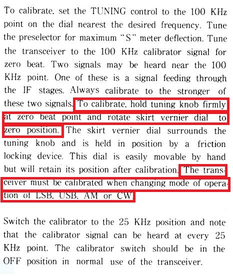 Inoltre, cosa estremamente importante e' la procedura di calibrazione che in USB e LSB non si fa per il massimo segnale ricevuto dal calibratore (marker), ma si deve fare a zero beat e cioe' a battimento zero . In pratica quando la nota scompare, quello e' lo zero e su quello devi regolare il verniero (ghiera).