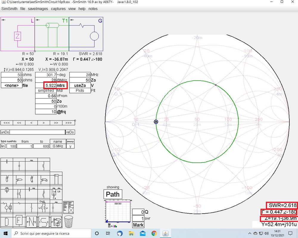 Se, per ipotesi il cavo fosse ideale, cioe' senza attenuazione e non senza le costanti distribuite, nel caso descritto con Z=50+J50 l'SWR misurato nel punto di alimentazione sarebbe 2.618 e coinciderebbe con l'SWR misurato in stazione e la potenza irradiata sarebbe 100W. L'unica differenza e' che sul carico abbiamo Z=50+j50 mentre lato trasmettitore abbiamo Z=19.138-J2.111 OHm. A tale proposito il grafico sulla Carta di Smith che descrive la situazione in esame. Se si prende una resistenza da 50OHM e la mettiamo in serie ad una induttanza che produce una XL=50OHm a 28MHz (284nH) e colleghiamo tale serie ai capi del cavo coassiale da 20 metri otteniamo questa situazione e senza correnti di modo comune. E' una semplice trasformazione di impedenza che si "svolge" lungo la linea.