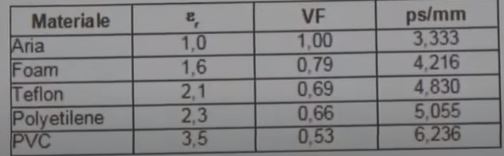 Riporto per comodita' la costante dielettrica e il fattore di velocita' per un segnale RF che attraversa un materiale diverso dall'aria.