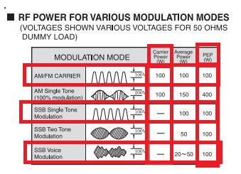 Ecco di nuovo la tabella che riporta la potenza misurata da un wattmetro a bobina mobile  nei vari modi di emissione :