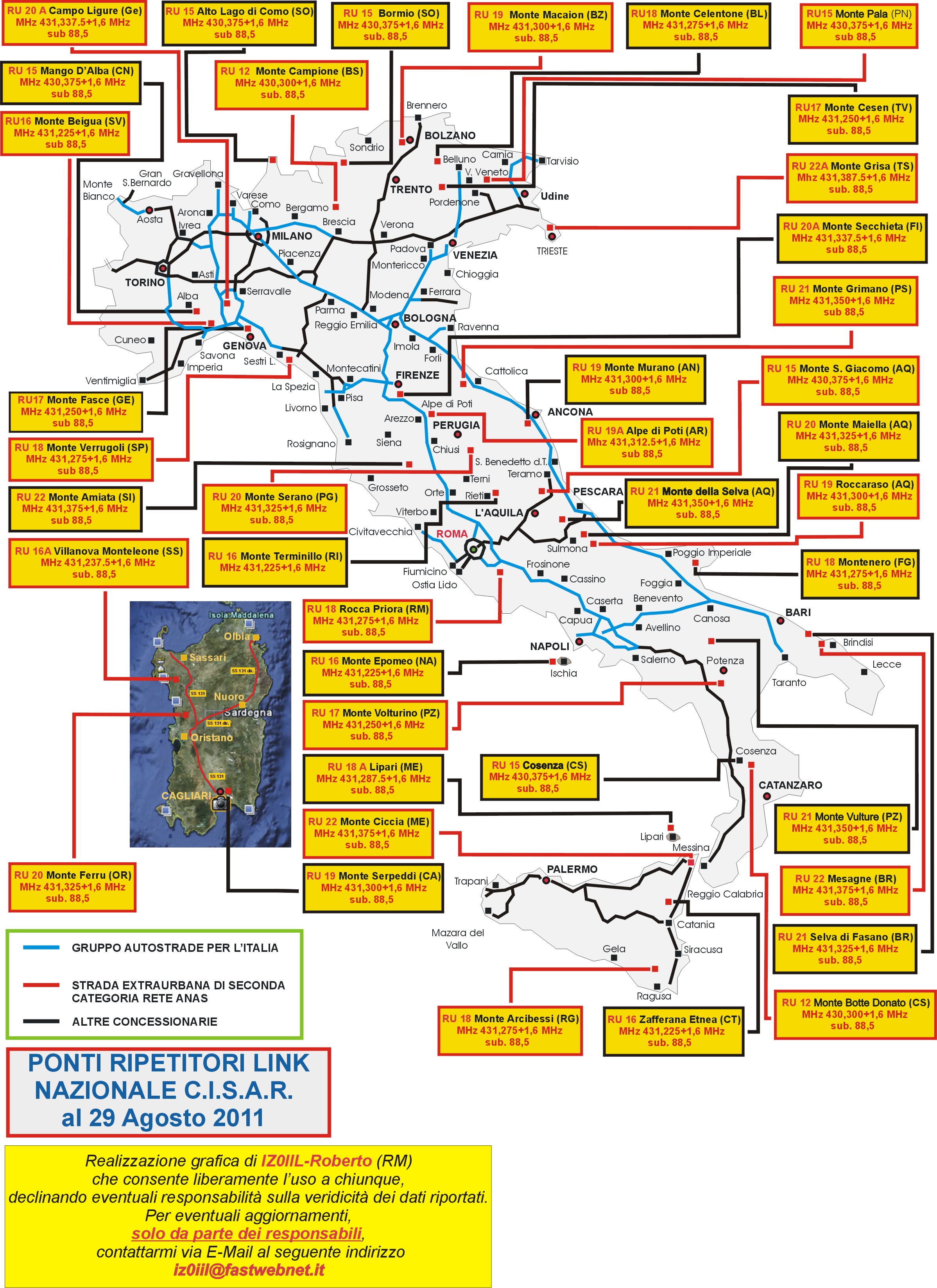 Disponibile la cartina aggiornata  con nuova veste grafica dei ripetitori del Link Nazionale C.I.S.A.R. riferita alle maggiori vie di comunicazione autostradali  italiane.