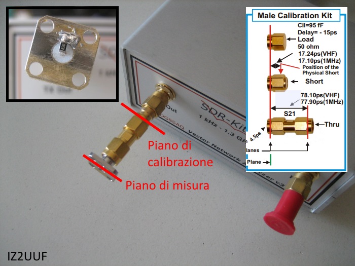 Per fare una misura accurata, saldiamo la resistenza su un connettore SMA da pannello. Supponiamo di avere il normale kit di calibrazione SMA maschio: il piano di calibrazione cade nel punto sbagliato: