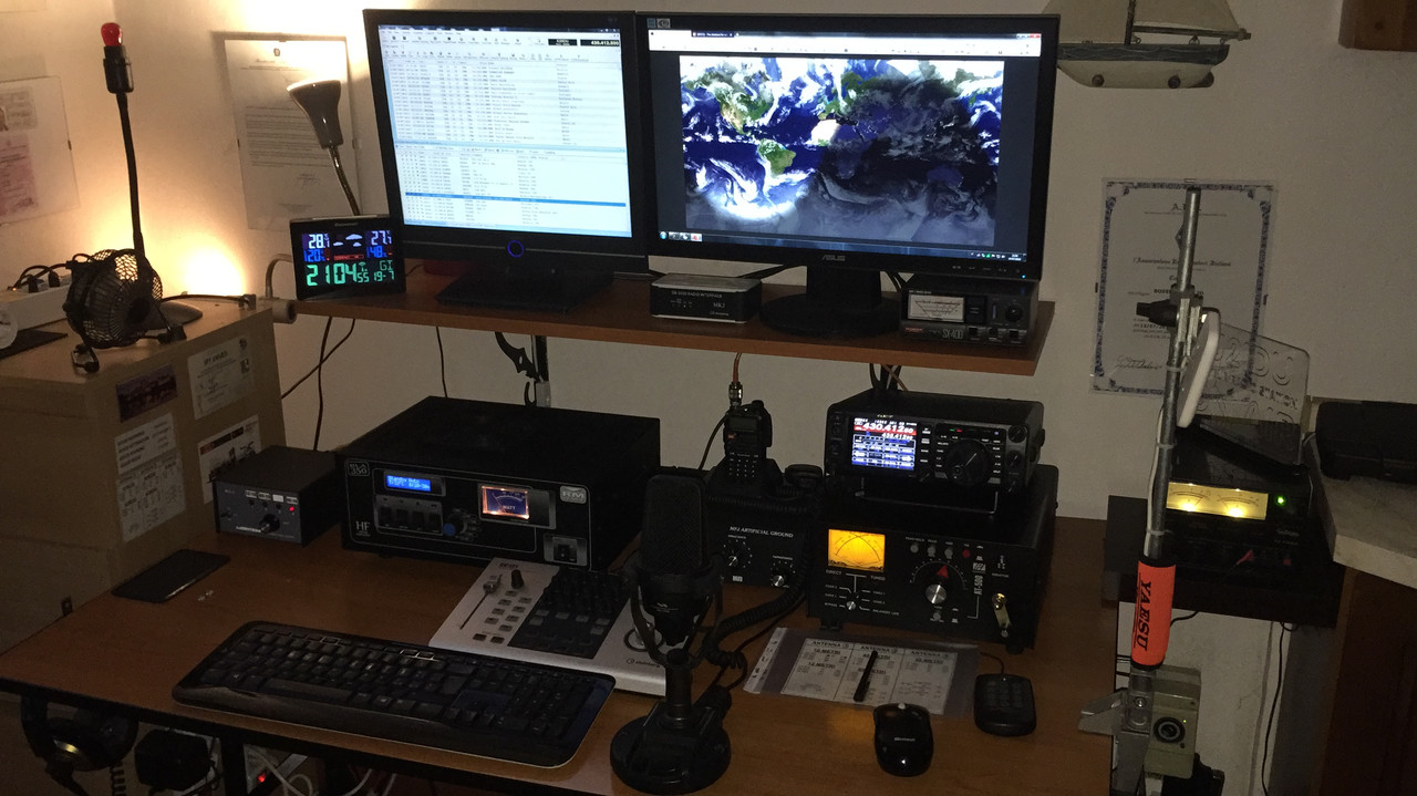 Ecco una foto della mia stazione in modalità TUTTO STACCATO (con tanto di cartelli per non dimenticarmelo) durante un temporale nell'estate 2017. L'accordatore della MFJ sembra fatto apposta per stare sotto il 991A....qui nella foto era comunque rialzato.
