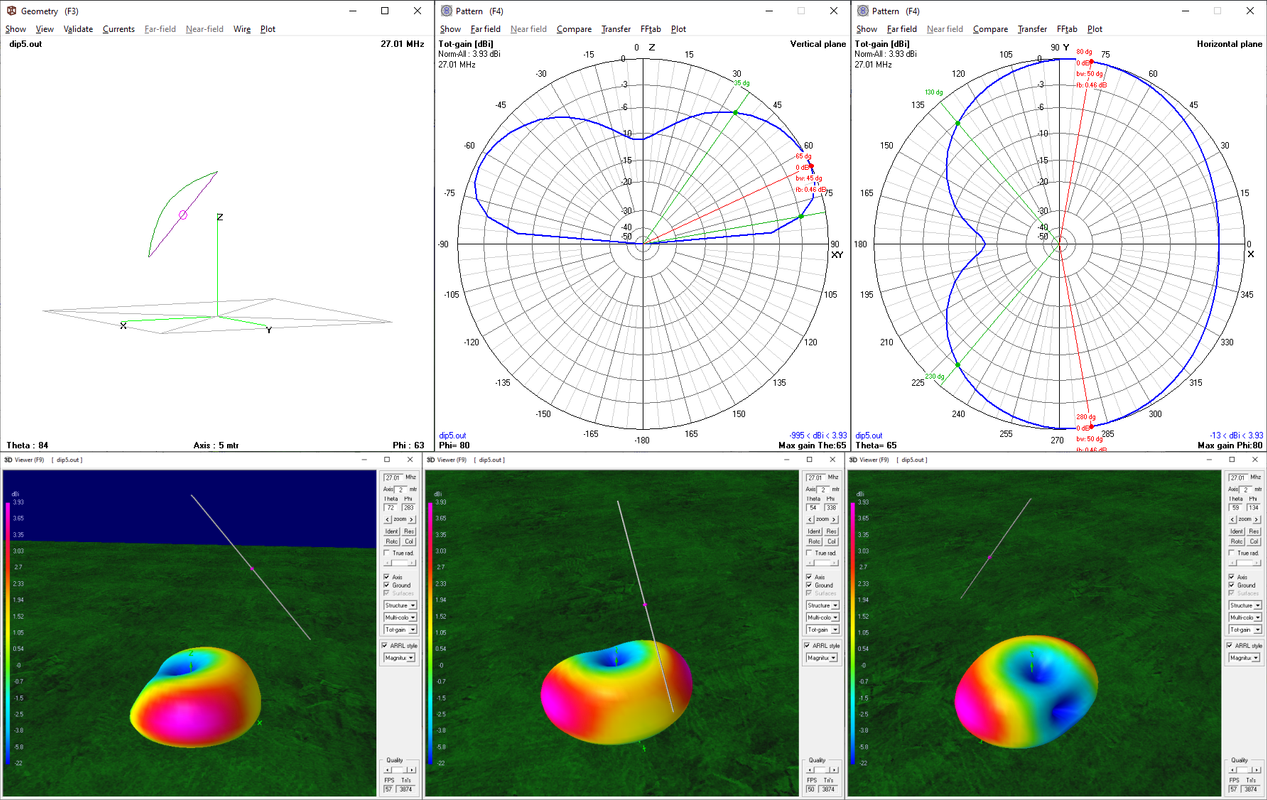 ed andiamo a variare il parametro "term" che regola l'altezza dei bracci in modo da cambiare il dipolo da orizzontale a V normale (estremi dei bracci più alti) o a V invertita (estremi dei bracci più bassi), otterremo dei risultati che, credo siano interessanti e che sono visibili sotto; nel caso in questione la simulazione è stata effettuata alzando/abbassando i bracci di 2m rispetto al punto di alimentazione centrale (posto a 1/2 onda dal suolo); notare i lobi, gli angoli di lancio ed il guadagno