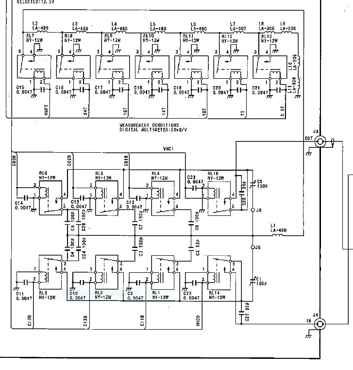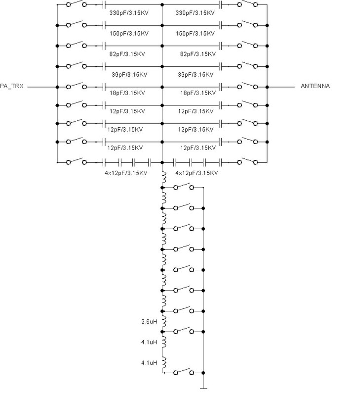Come si vede e' un accordatore a T dove pero' a differenza delTS-940, anch'esso a T, i due condensatori variabili motorizzati sono stati sostituiti da una serie di condensatori fissi e commutati. L'induttanza e' anch'essa a prese calcolate e non e' un roller, come peraltro anche nel TS-940.
