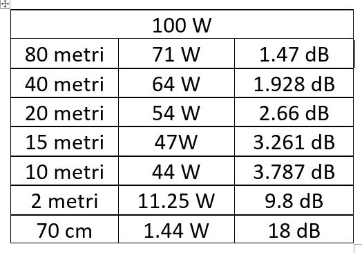 Ora riassumo con la seguente tabella, dove con 100 W in uscita dal trasmettitore e supponendo un carico di 50 OHm perfetti (antenna risonante X=0, R=50 OHm per ogni banda), quanto e' la potenza che arriva al carico e a fianco l'attenuazione introdotta dal cavo che vale anche in ricezione.